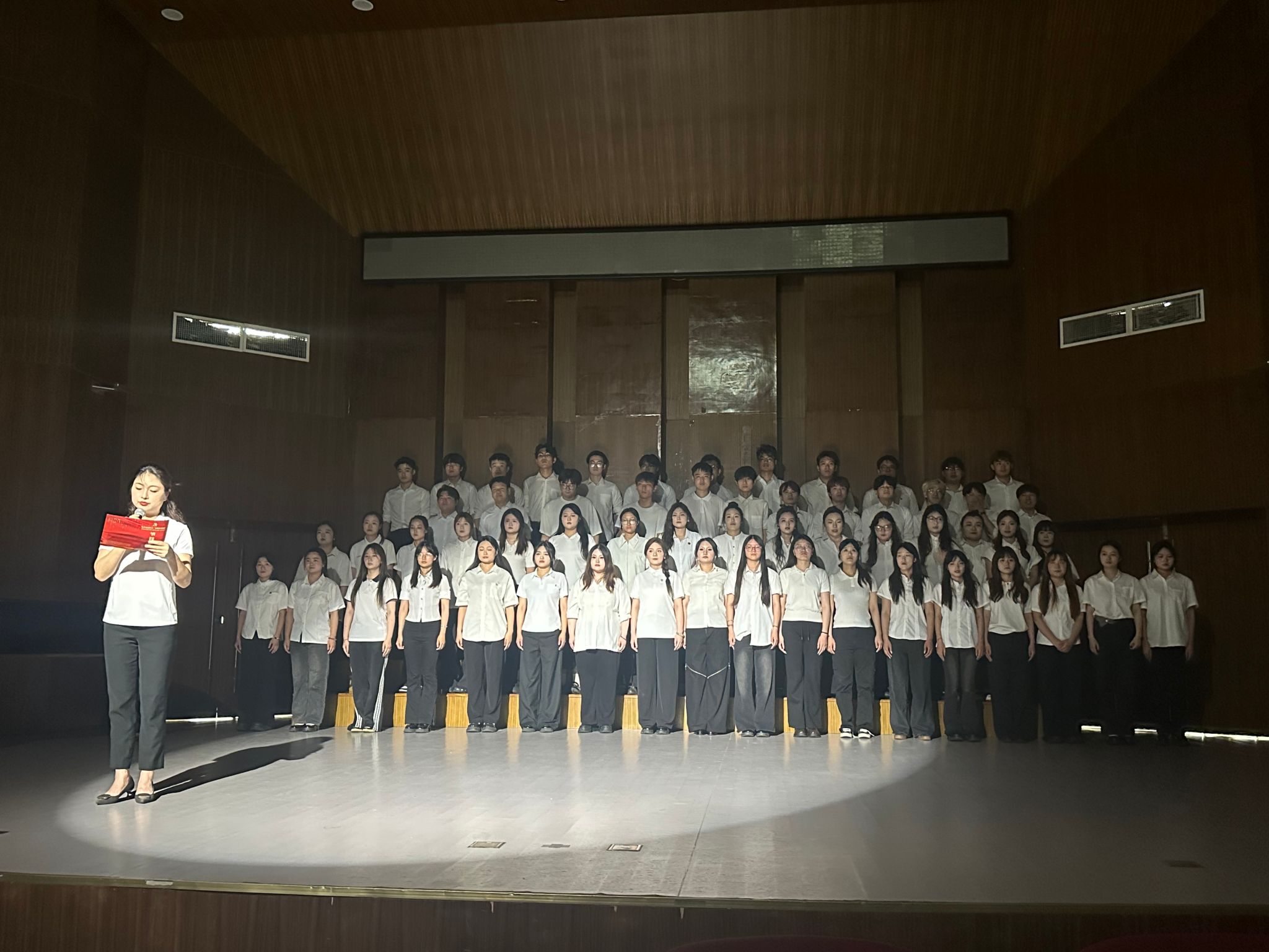 活动现场,红色旋律与党史宣讲交融共鸣。一曲《松花江上》拉开帷幕,瞬间带领观众回到山河破碎的往昔;《毕业歌》里“同学们,大家起来”的呐喊,重现爱国青年投笔从戎、奔赴救亡前线的热血场景;《义勇军进行曲》作为民族解放的号角,以铿锵旋律点燃全场爱国热忱,激发奋进力量。《长城谣》勾勒的山河图景,诉说国人对故土的眷恋与守护决心;《黄河怨》用悲怆曲调传递黄河儿女的苦难哀怨与抗争怒火;《三大纪律八项注意》彰显人民军队纪律严明、一心为民的本色,映照党的优良作风。《游击队歌》展现了游击健儿灵活作战的英姿;《延安颂》描绘了革命圣地延安的精神光芒,传递信仰力量;《嘉陵江上》倾诉着对故乡沦陷的悲愤与收复失地的渴望;《歌唱二小放牛郎》以质朴旋律讲述小英雄王二小的壮烈故事,唤起对先烈的敬重;《没有共产党就没有新中国》引发全场共鸣合唱,诠释党的引领与民族新生的关联;《歌唱祖国》以恢弘的气势收尾,凝聚师生对祖国的热爱与祝福。