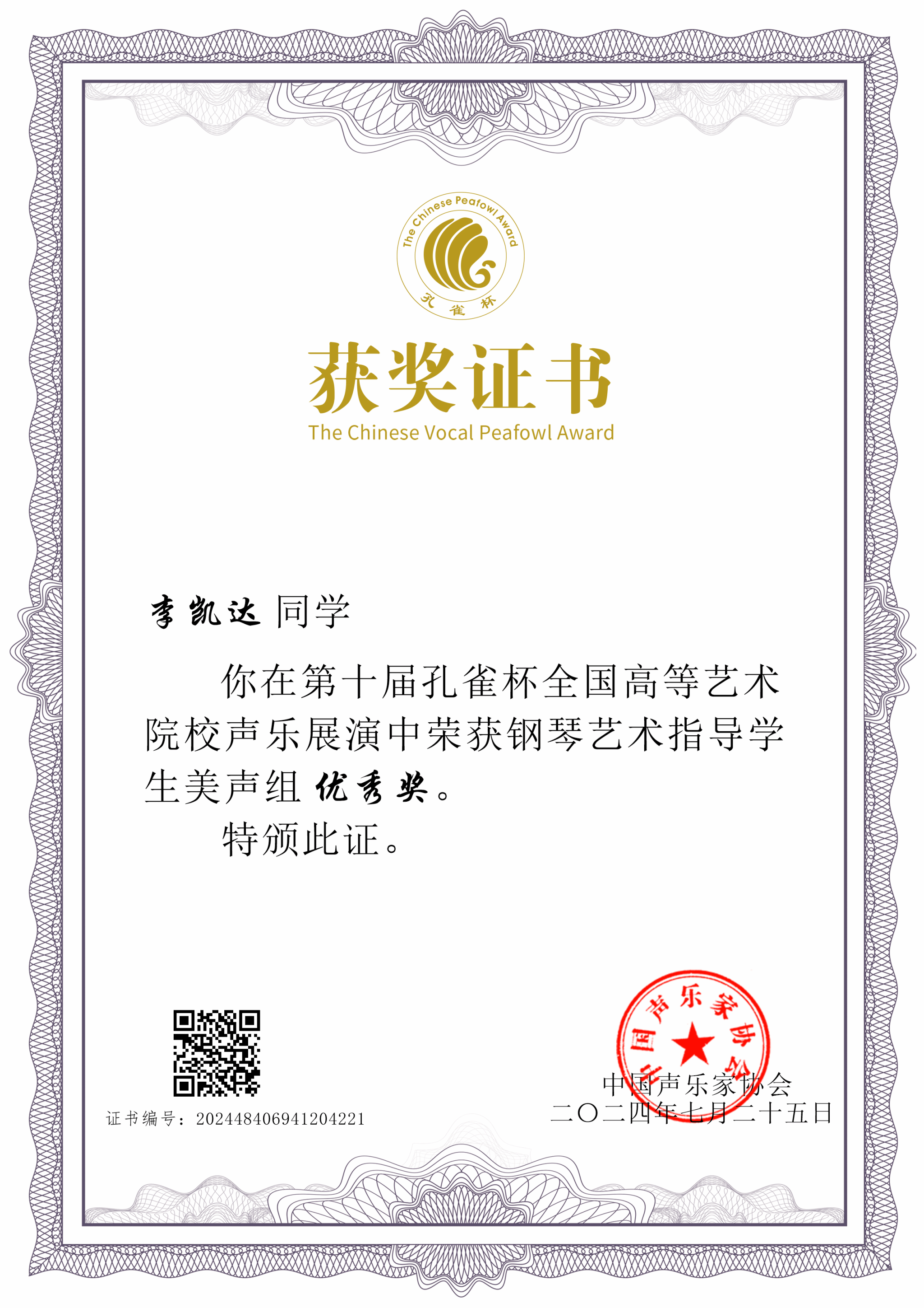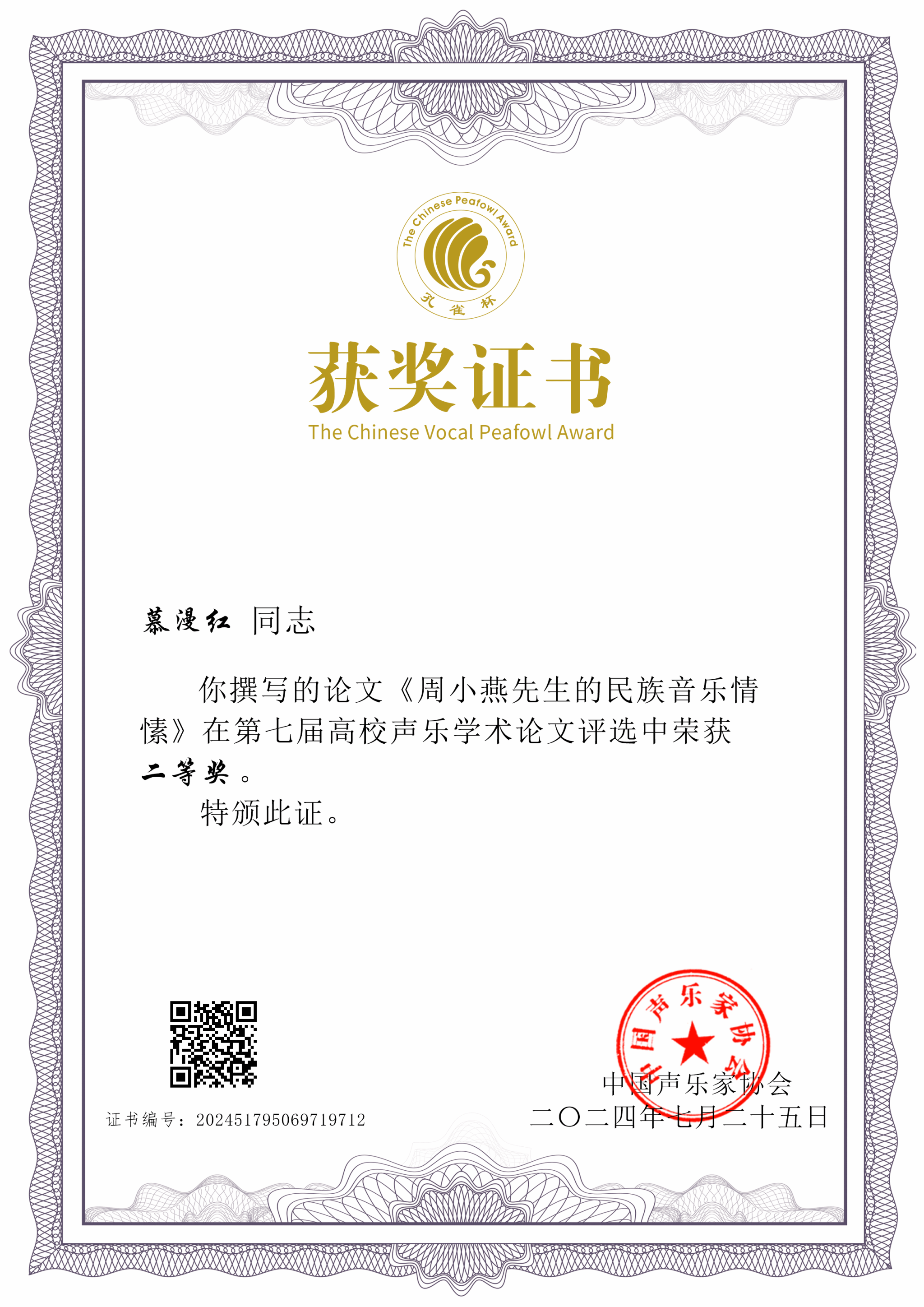 近日,备受关注的“第十届孔雀杯高等艺术院校声乐展演暨第八届高校声乐学术交流活动”日前在广州落下帷幕,我院师生在近4000名展演选手中表现突出,在参加的3个组别展演中均取得不错成绩,其中慕漫红获“高校声乐学术论文”教师组二等奖,李韵涵获“综合师范院校本科生美声组”优秀奖(指导教师谢梦柯、苏丽丽),李凯达获“钢琴艺术指导学生美声组”优秀奖(指导教师叶蕾),太阳成集团tyc41183获颁优秀组织奖。