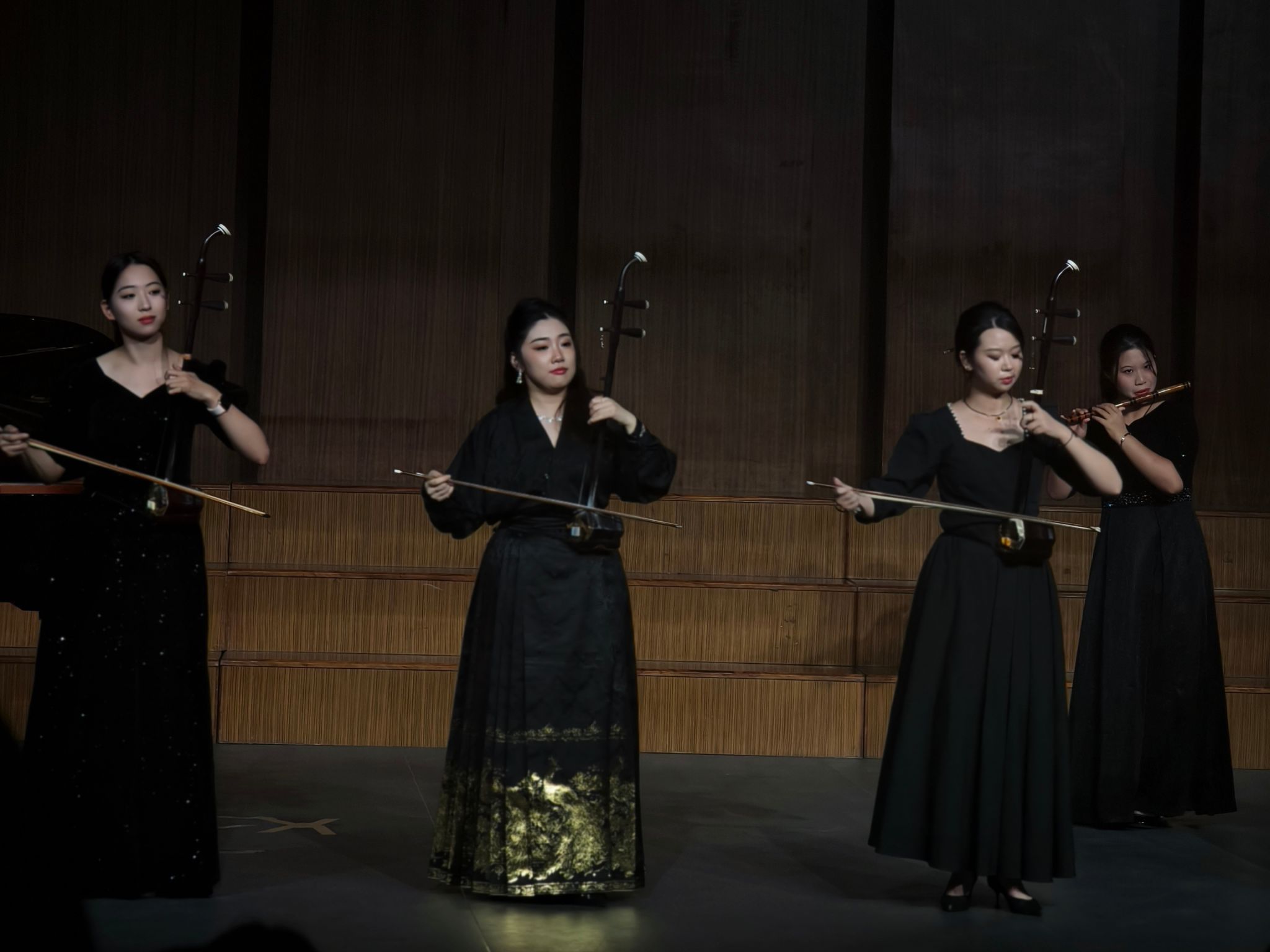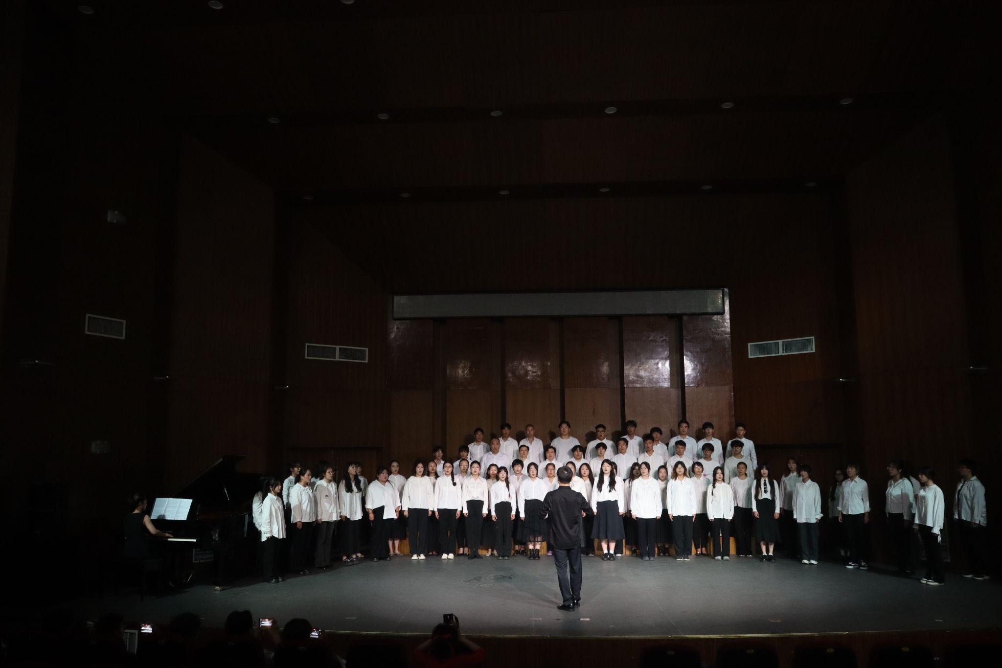 本次活动在民乐合奏《新赛马》中拉开了序幕,原创性与传统性的碰撞,给听者带来更独特的心灵感受。女声独唱《敕勒歌》,展现了我国民族音乐特有的韵味。四手联弹《茉莉花》,以高超的演奏技术表现了我们强大的民族自信。女生独唱《幽兰操》,用歌声表达了中华民族对君子操守的尊崇。室内乐《自由探戈》将观众们带到热情洋溢的阿根廷舞蹈情境中,感受到改革开放以来,新中国展现出来的开放包容的大国风范。原创舞蹈《学子》塑造了新时代的大学生为了实现民族共同繁荣,奔赴草原、建设边疆的事迹,将观众带入五十六个民族一家亲的团结氛围中。长笛单簧管钢琴三重奏《华尔兹舞曲》将紧张的气氛转向更为轻松的氛围。表演唱《弥渡山歌》、《爱我中华》、女声独唱《眺望》、男声独唱《我爱你,中华》倾情表现全国各族人民对祖国母亲的热爱。钢琴独奏《松花江上》、钢琴独奏《又见大别山花开》提醒观众不忘中华民族苦难历史,鼓励大家继往开来,接续前行,创造伟业。全场师生合唱《走向复兴》感染着在场的每一位观众,表达了每一位中华儿女热爱伟大的党、歌唱伟大祖国,迎接中华民族伟大复兴的强烈愿望。在经久不息的掌声与欢呼声中,本次活动落下帷幕,华银峰和部分领导上台与演员合影留念。
