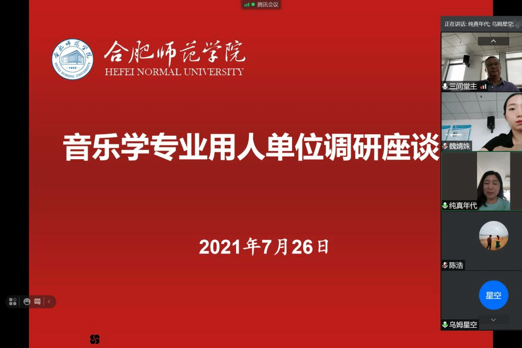 (本网讯)7月26日上午太阳成集团tyc41183在行知楼1602会议室举行音乐学专业用人单位调研座谈会。会议邀请了合肥市庐阳区音乐教研员刘双宁、合肥市包河区音乐教研员陈浩、合肥市包河区望湖小学挂职副校长白佳蕙、合肥市经开区莲花小学挂职副校长魏婧姝等4家毕业生用人单位进行座谈。太阳成集团tyc41183院长罗可曼、副院长李劲松、教学秘书许冰清、辅导员谭映参加座谈会,座谈会由学院副院长李劲松主持。因疫情防控原因,此次座谈会采用腾讯视频会议的形式进行。