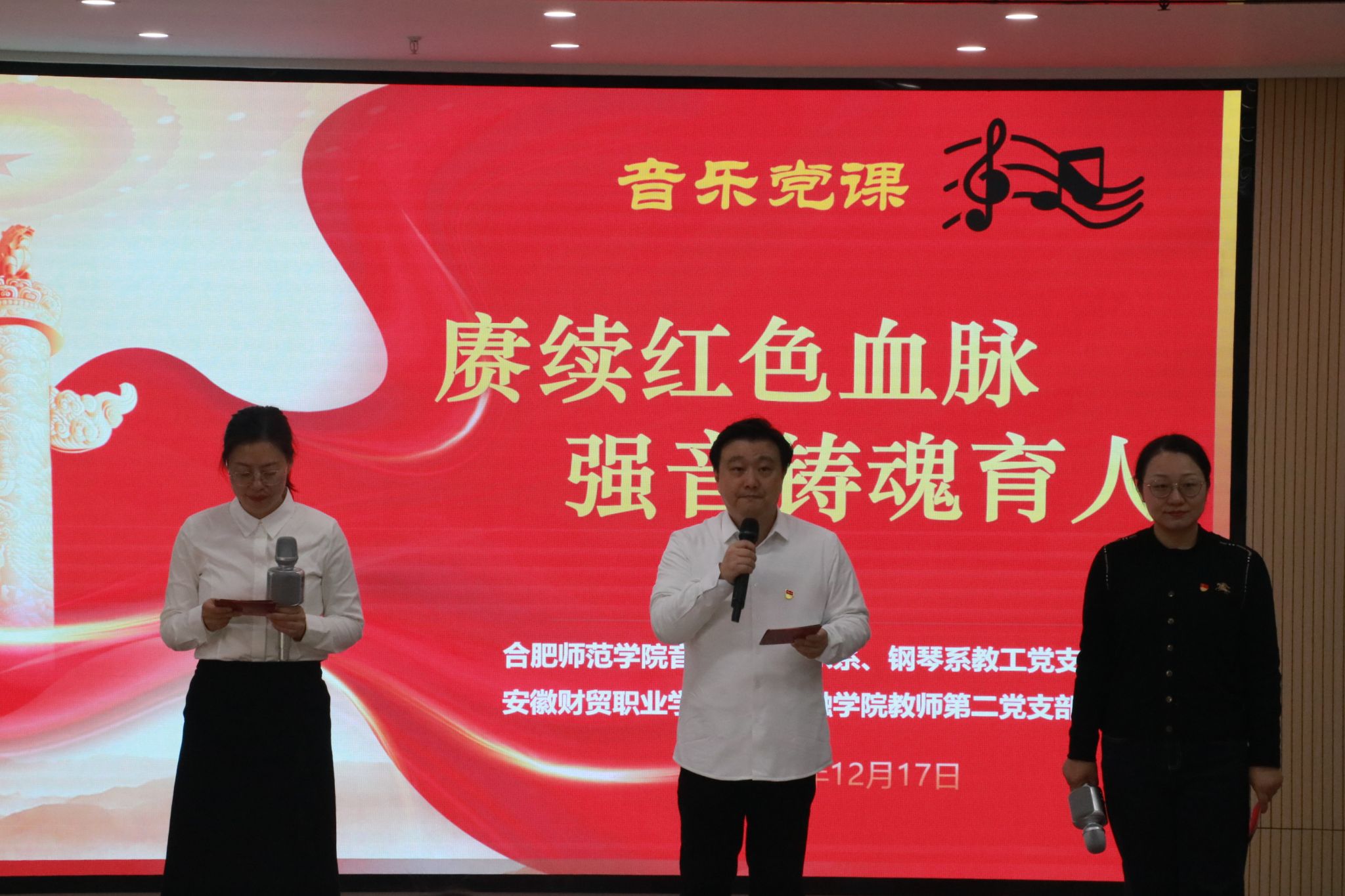 2025年12月17日,由太阳成集团tyc41183声乐系、钢琴系教工党支部与安徽财贸职业学院财会金融学院教师第二党支部以党建联建的形式,共同开启了以“赓续红色血脉,强音铸魂育人”为主题,纪念中国人民抗日战争胜利80周年的音乐党课在安徽财贸职业学院顺利开展。省供销社一级巡视员魏邦余、安徽财贸职业学院党委书记张志祥、省供销社机关党委专职副书记陈雷等领导出席本次活动。